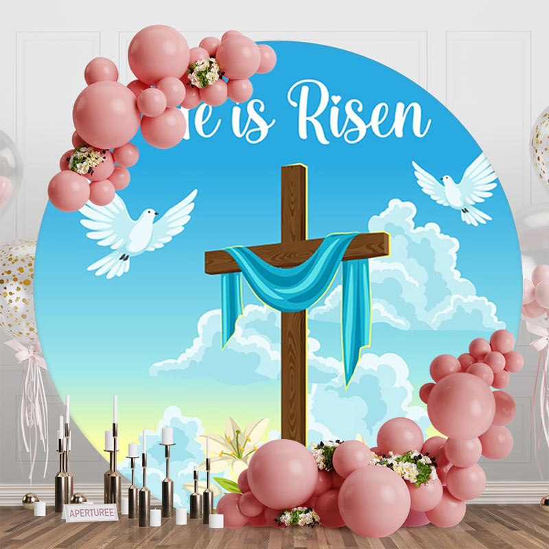 Blue Sky Cross He Is Risen Round Easter Backdrop