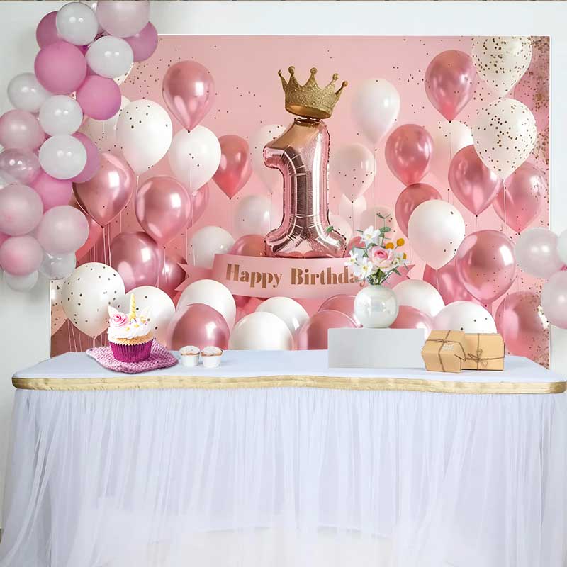Lofaris 3D Pink and White Balloons 1st Birthday Backdrop, Gold Crown and Number 1 Party Decoration
