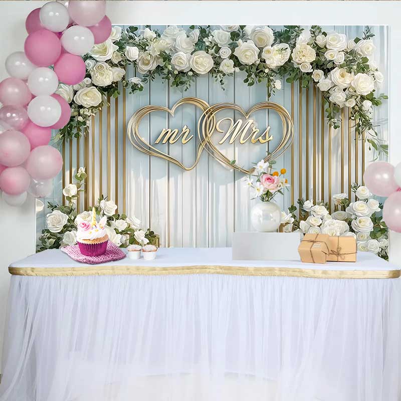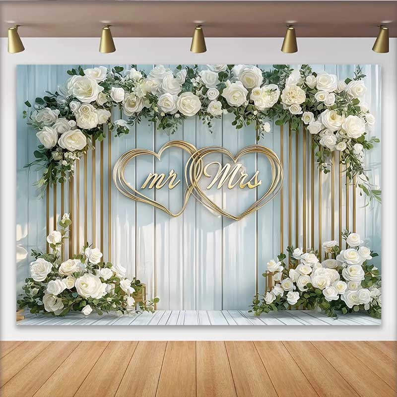 Lofaris Arched White Floral Mr and Mrs Wedding Backdrop, Gold Hearts Ceremony Party Decoration
