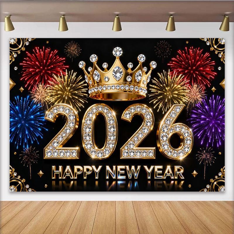 Lofaris Black Gold Diamond 2026 Happy New Year Party Backdrop with Crown and Colorful Fireworks, New Year's Eve Celebration