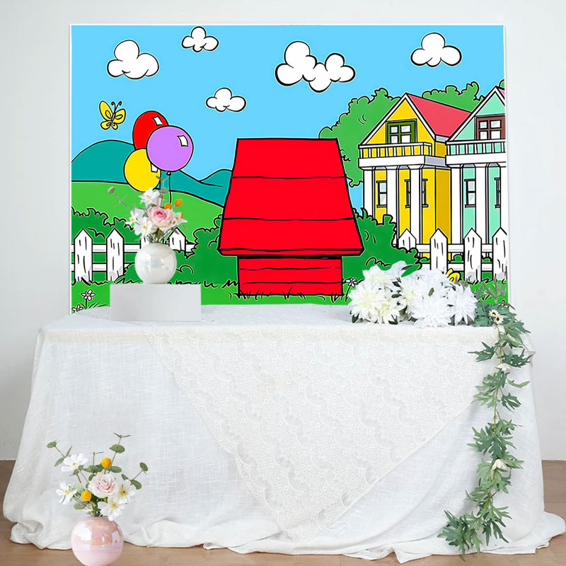 Lofaris Cartoon Green Grass Red House Birthday Backdrop