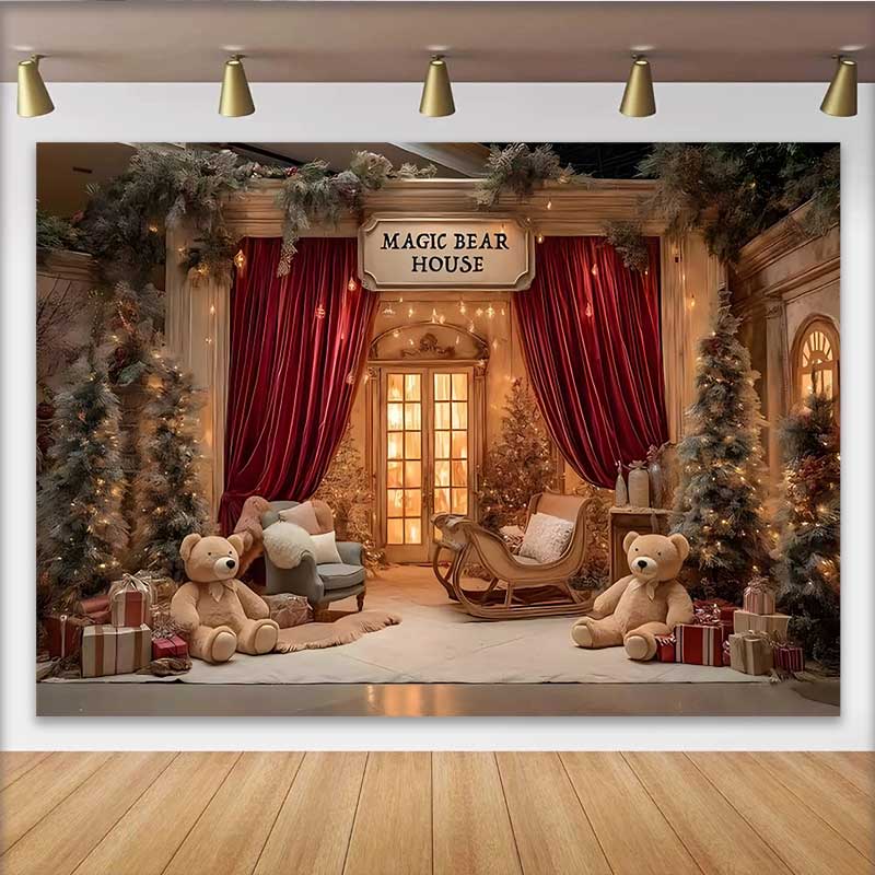 Lofaris Christmas Magic Bear House Backdrop, Red Velvet Curtains and Teddy Bear Sled Decoration