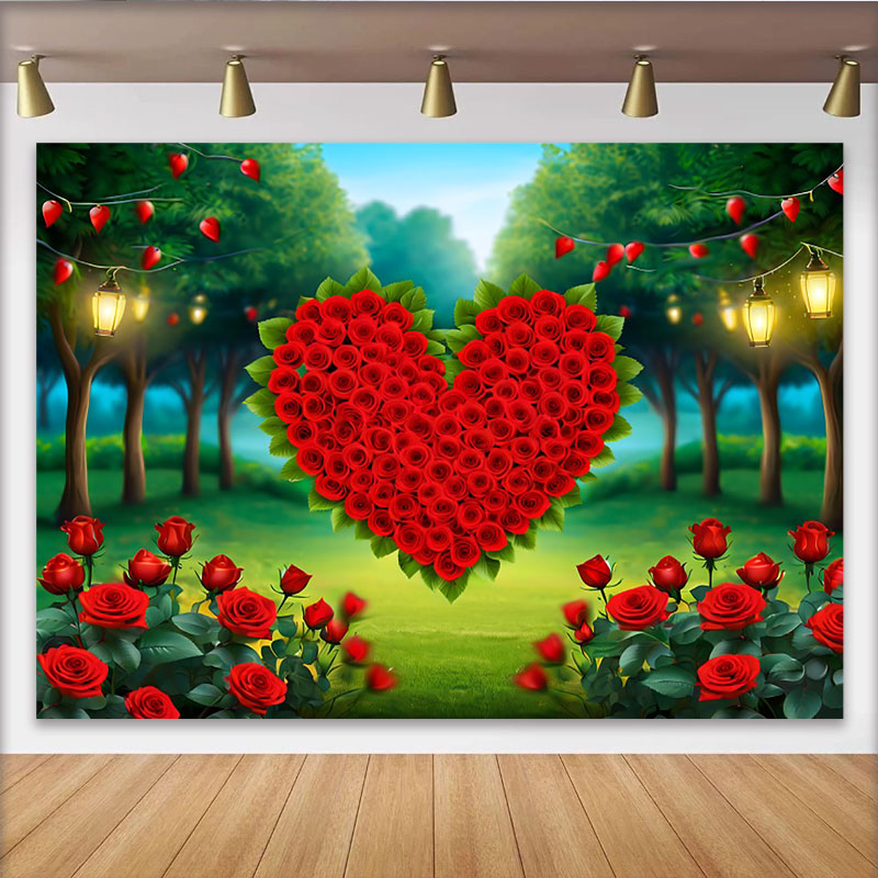 Lofaris Enchanted Forest Heart Backdrop, Red Rose Heart and Fairy Lights for Valentines Party