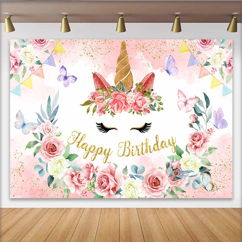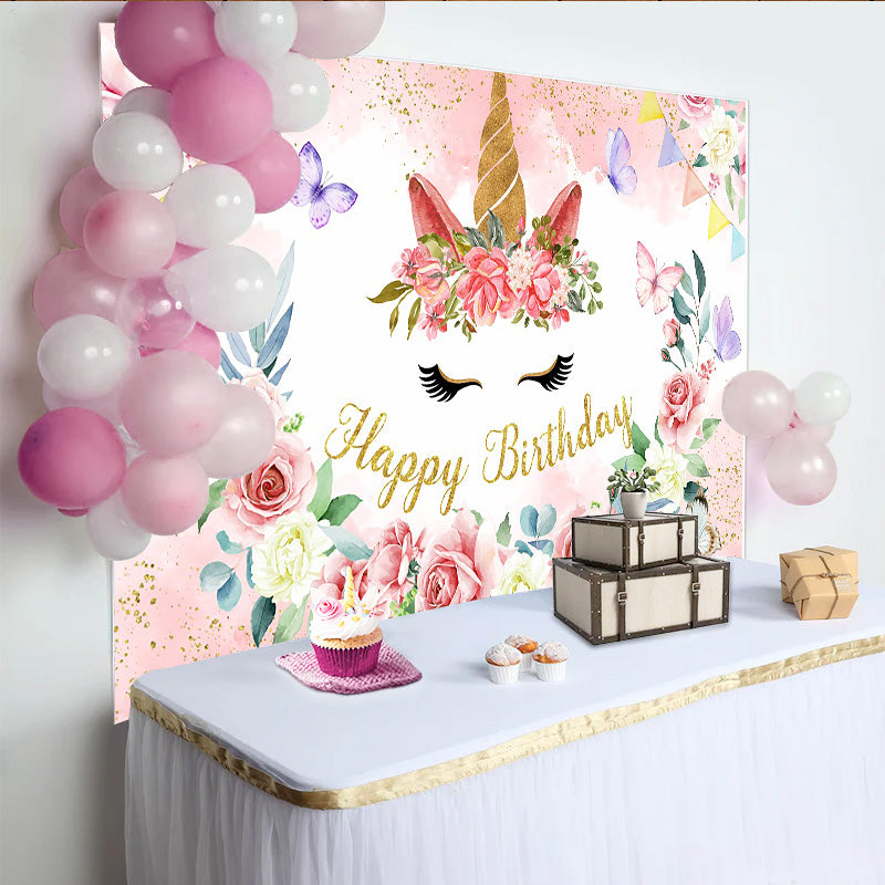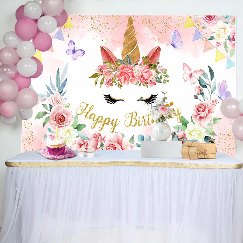 Lofaris Floral Unicorn Face Backdrop, Golden Horn and Pink Rose Photography Background for Girls Birthday Party