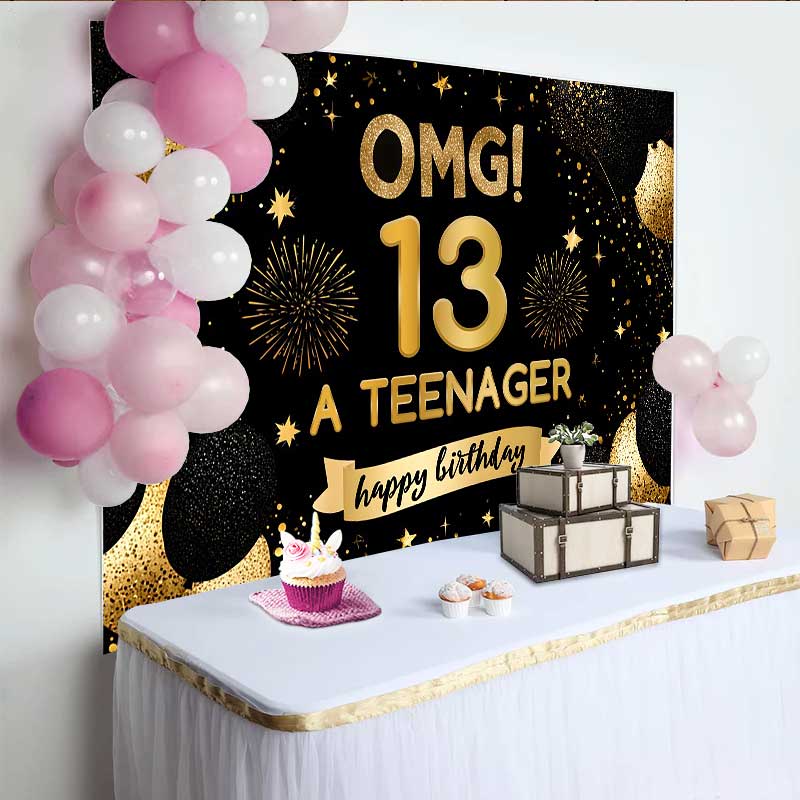 Lofaris Gold Glitter OMG 13th Birthday Backdrop, 13 A Teenager Milestone Party Decoration
