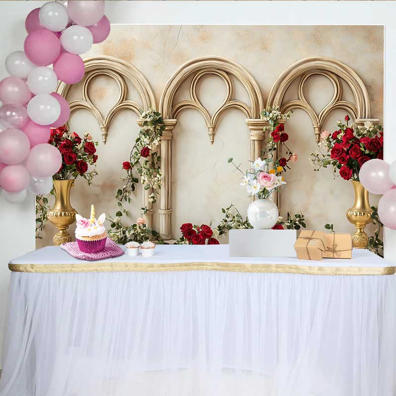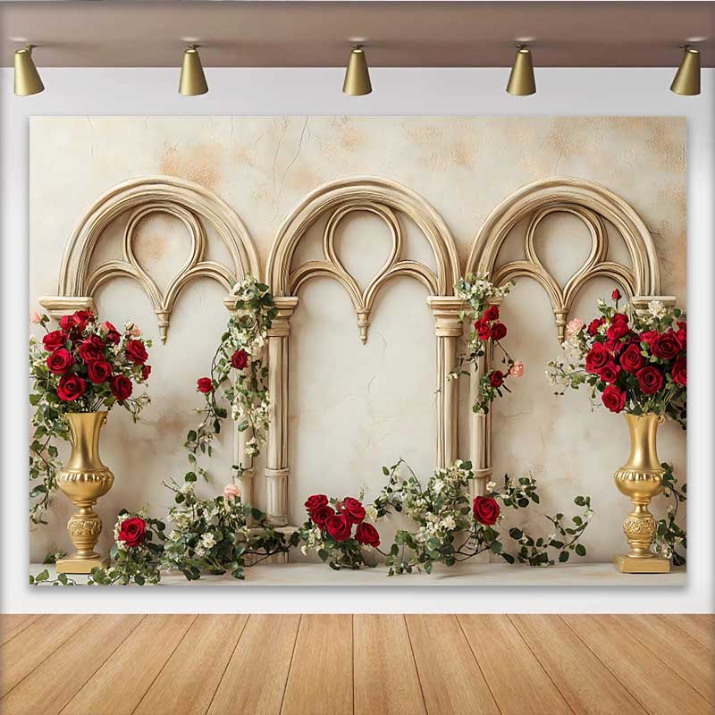 Lofaris Gold Gothic Arch Red Rose Backdrop, Floral Vase Wedding Background, Valentines Day Photography Prop