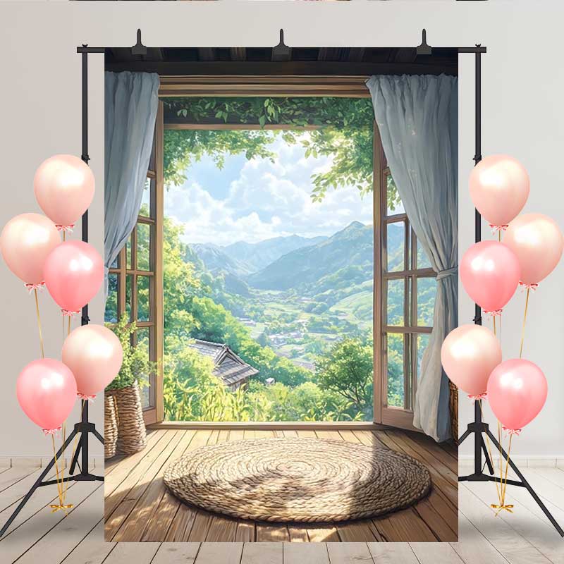 Lofaris Japanese Zen Room Backdrop, Round Rug and Open Window with Lush Green Mountain View