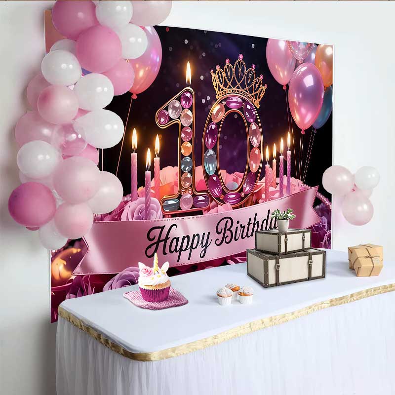Lofaris Jeweled 10th Birthday Party Backdrop, Pink Balloons and Roses Happy Birthday Banner