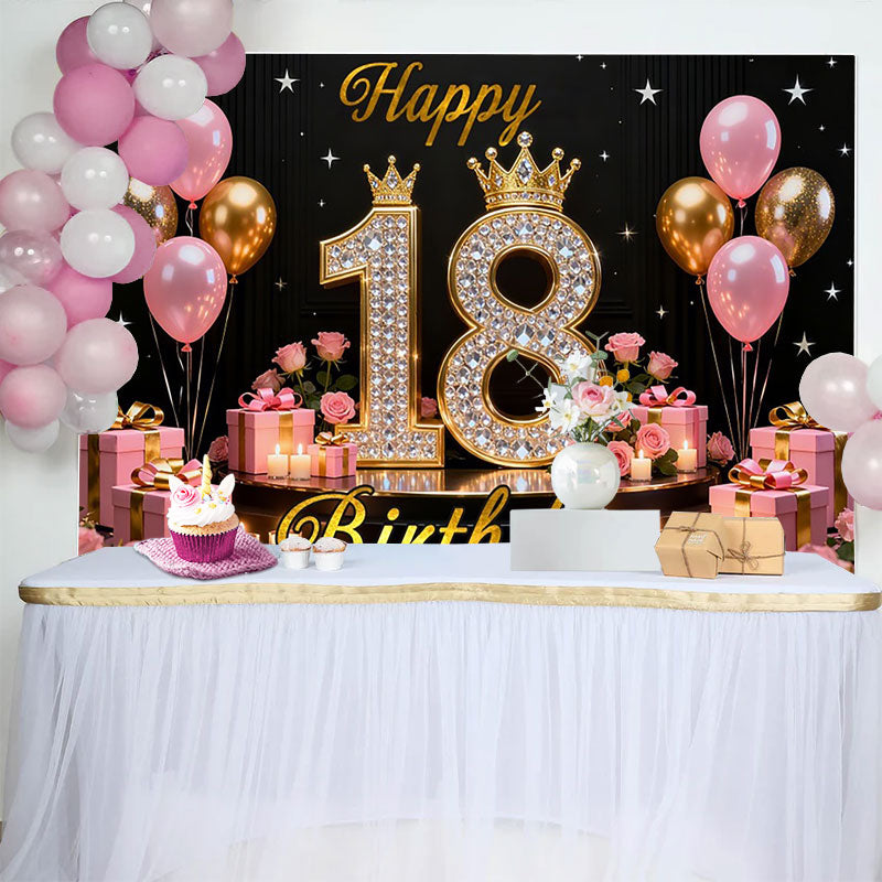 Lofaris Luxury 18th Happy Birthday Backdrop, Pink and Gold Diamonds Background with Crowns and Roses for Girls