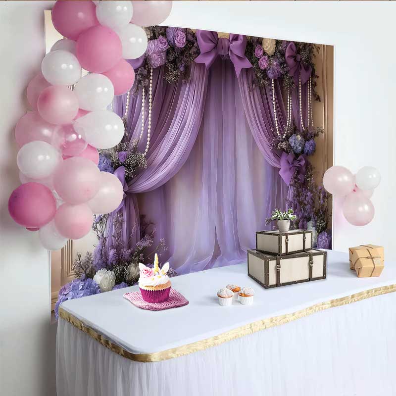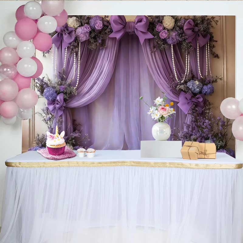 Lofaris Luxury Purple Wedding Backdrop, Lavender Draping with Pink Bows and Pearl Accents