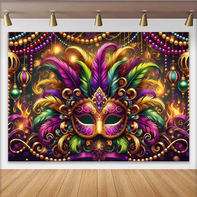 Lofaris Mardi Gras Grand Gala Backdrop, Multi-Color Feather Mask and Golden Beads Banner