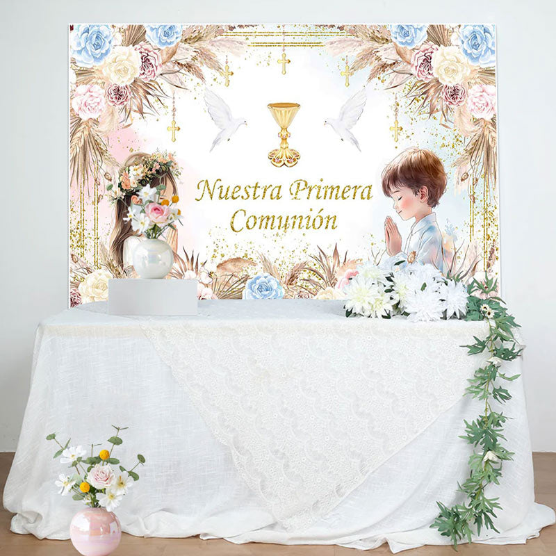 Lofaris Nuestra Primera Comunion Boho Floral Baptism Backdrop