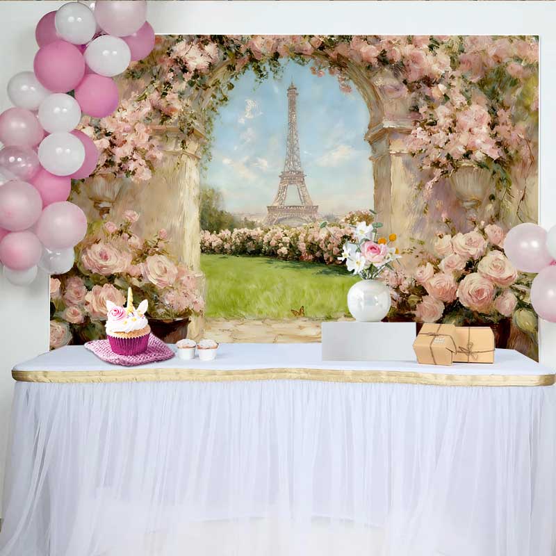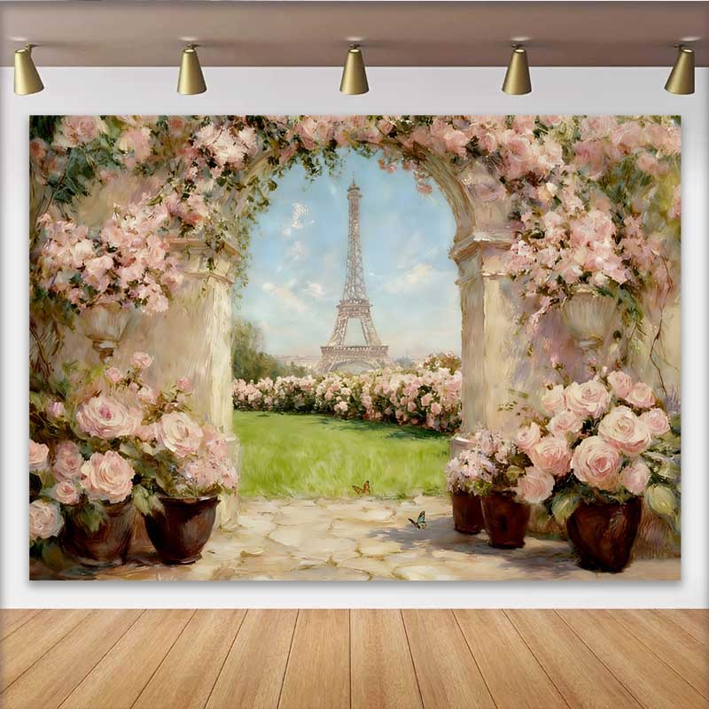 Lofaris Photography Backdrop, Paris Eiffel Tower Spring Pink Rose Oil Painting Style Decor