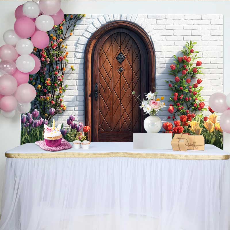 Lofaris Photography Backdrop, Spring Colorful Tulips Wooden Door Rustic Garden Background