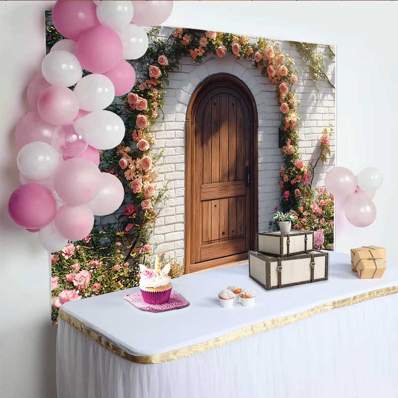Lofaris Photography Backdrop, Spring Rustic Wooden Door Pink Rose Floral Arch Decoration