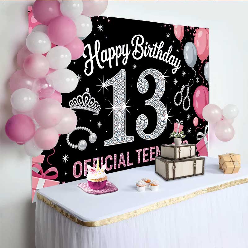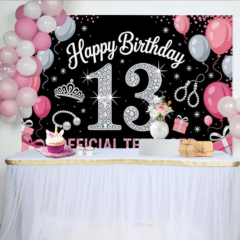 Lofaris Pink and Silver 13th Birthday Backdrop, Official Teenager 13 Tiara and Pearls Party Decoration