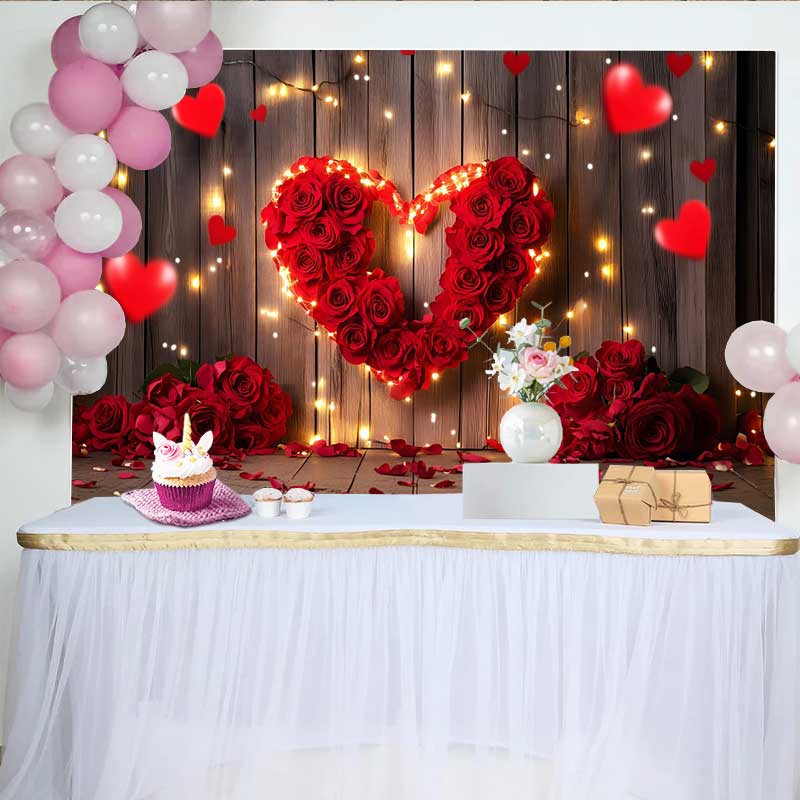 Lofaris Red Rose Heart Valentines Day Backdrop, Glowing Fairy Lights and Rustic Wood Party Decoration