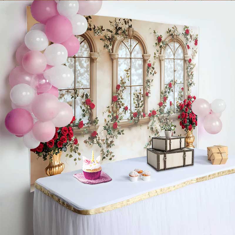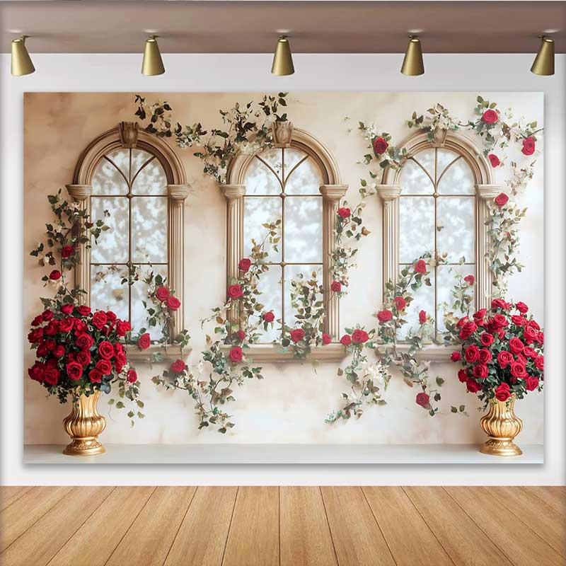Lofaris Red Rose Window Arch Backdrop, Gold Vase Floral Wedding Background, Valentines Day Photo Shoot Prop