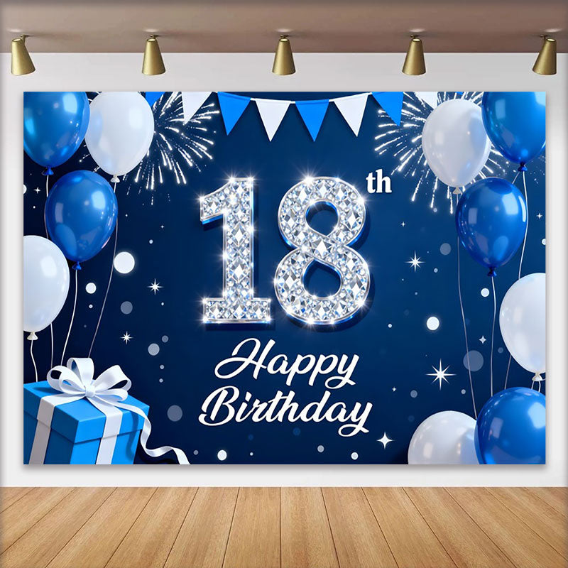 Lofaris Royal Blue and Silver 18th Birthday Backdrop, Diamond Numbers and Fireworks Background, Anniversary Decor