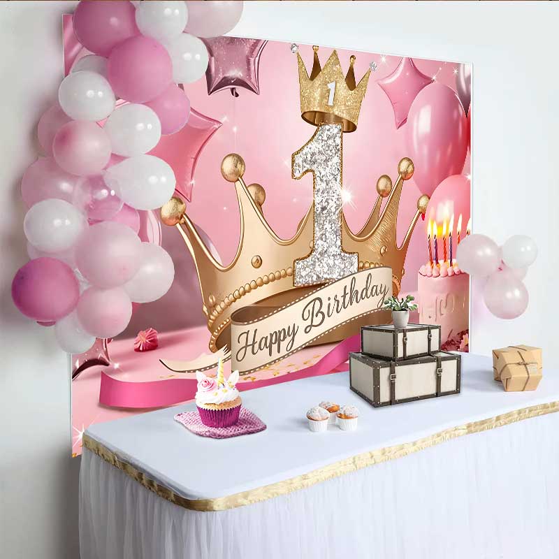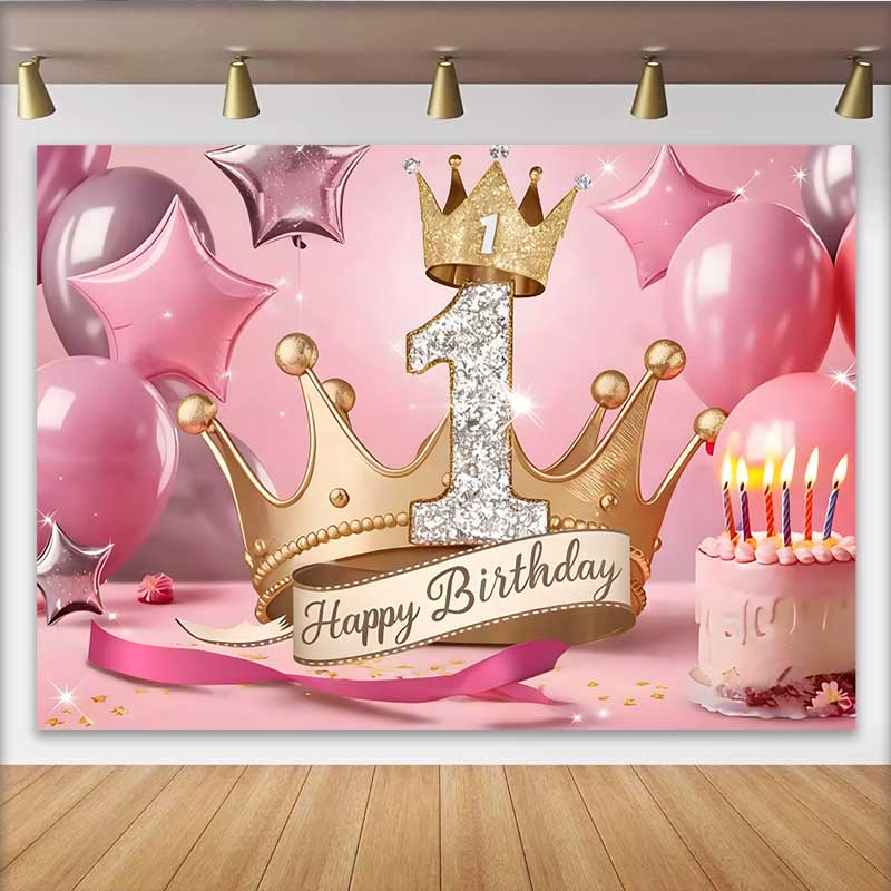 Lofaris Royal Gold Crown 1st Birthday Backdrop, Pink Stars and Cake Milestone Party Decoration