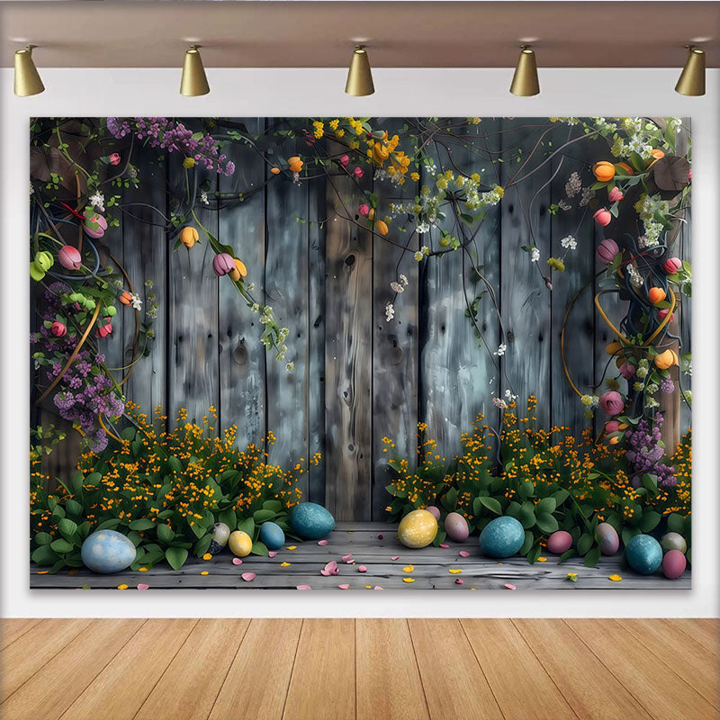 Lofaris Rustic Easter Wood Backdrop, Spring Floral and Colorful Eggs Photography Background
