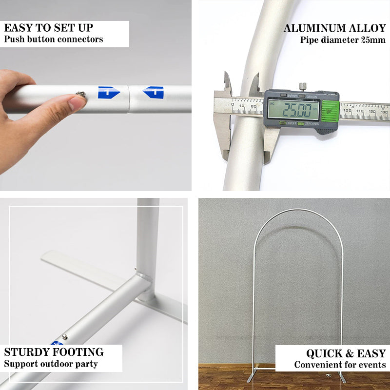 Our rust and fade-resistant Aluminum Wedding Arch is more durable than traditional iron stands, ensuring it lasts for years to come. With innovative elastic bands inside each pipe, it can be quickly assembled by just one person, making it incredibly easy to set up.
