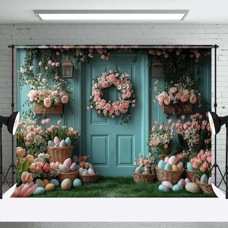 Lofaris Spring Pink Floral Eggs Blue Wall Easter Backdrop