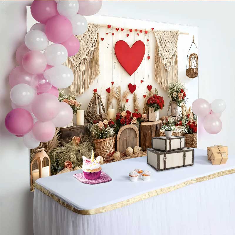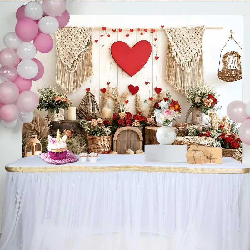 Lofaris Valentine's Day Backdrop, Boho Macrame Red Heart Rustic Wood Wall Decoration