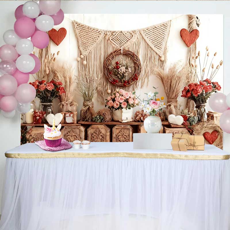 Lofaris Valentine's Day Backdrop, Boho Rustic Wooden Crates Macrame Pink Rose Garland