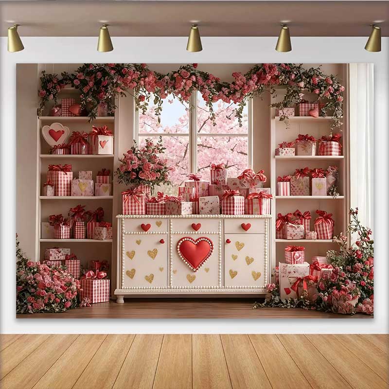 Lofaris Valentine's Day Backdrop, Pink Cherry Blossom Window Red Heart Cabinet Prop