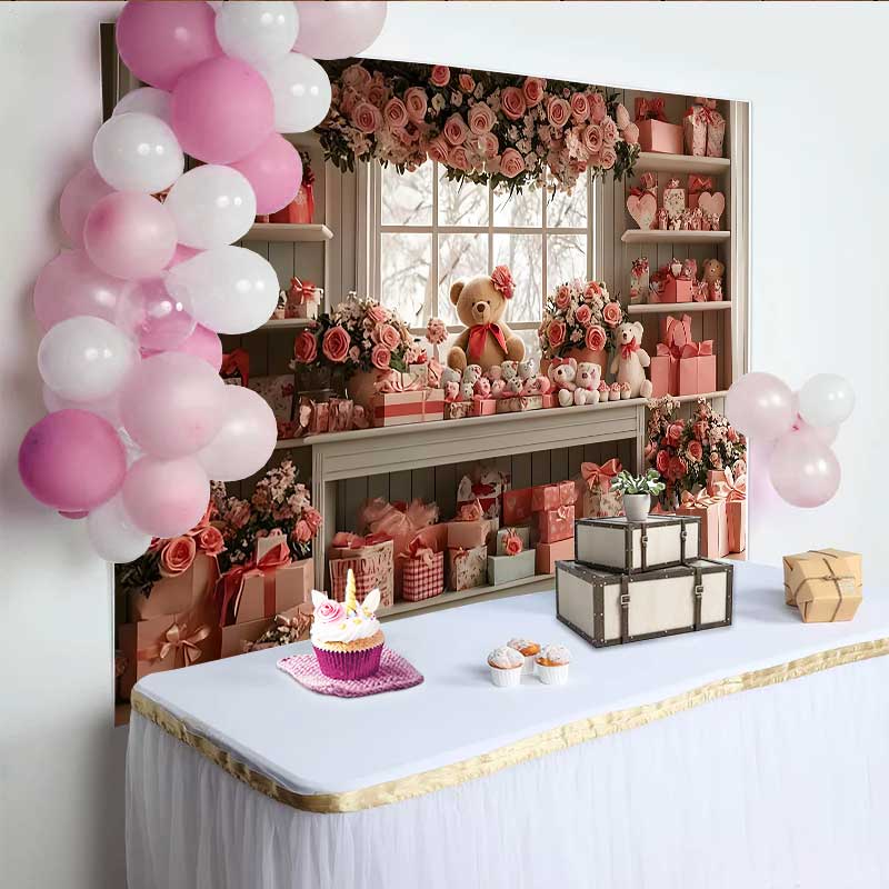 Lofaris Valentine's Day Backdrop, Pink Floral Teddy Bear Window Gift Shop Decoration