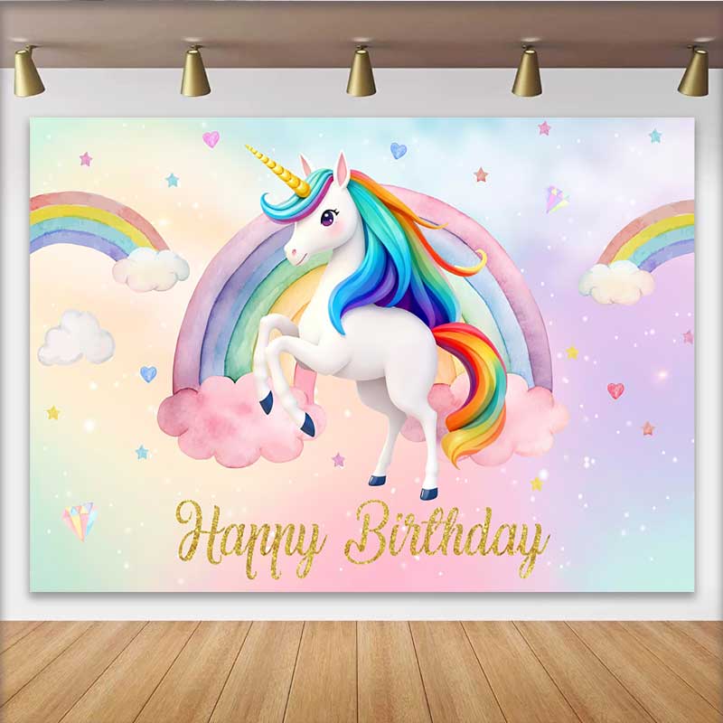 Lofaris Watercolor Unicorn Rainbow Backdrop, Happy Birthday Clouds and Stars Party Banner