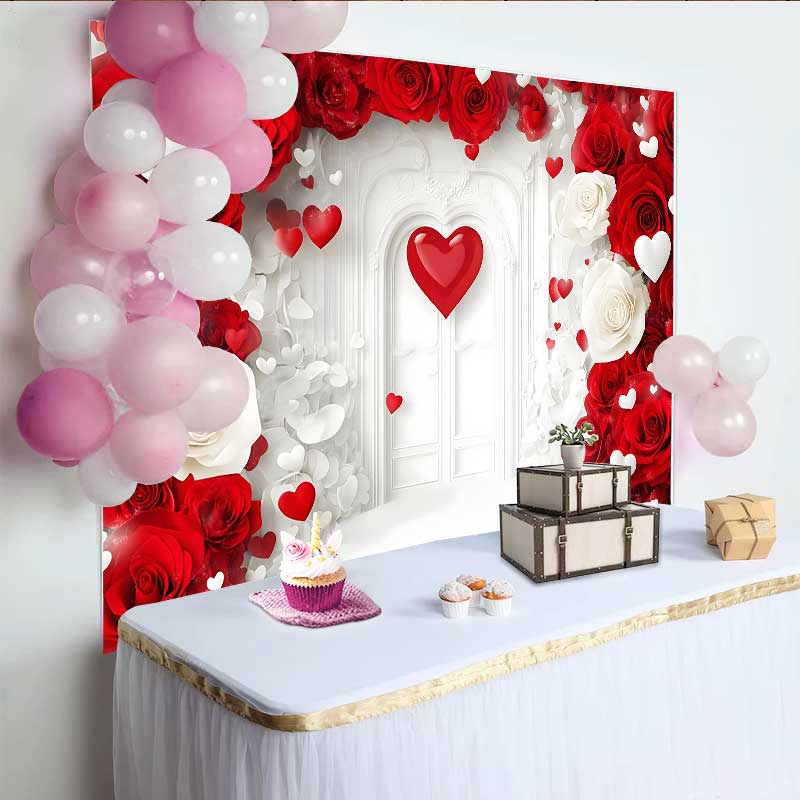 Lofaris White Arch Door Floral Backdrop, Red and White Roses for Valentine's Day Wedding, Romantic Photography Studio Background